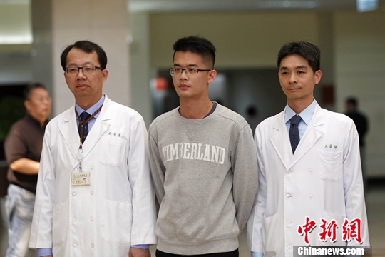 圖為李敖之子李戡(中)當天下午在台北“榮總”醫院出席記者會。李戡稱,遵照父親遺願,身後事一切從簡。中新社記者 陳小願 攝