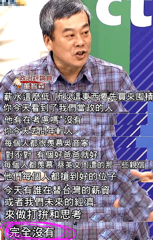 政治評論員董智森表示,薪水已經這麼低了,但並沒有看到台當局有人為經濟做打拼和思考,他還調侃,如今島內年輕人都很羨慕那個“有個好爸爸”的吳音寧及蔡英文周遭的親信,因為“每個人都能搶到(拿錢多還不用幹事兒啊)好位置”。