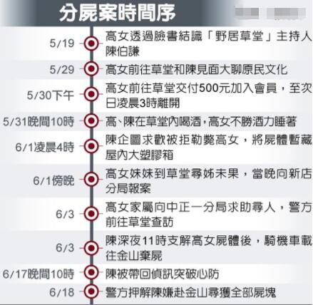 中國台灣網6月19日訊 短短1個月內,台灣就發生了3起殺人分屍案!據台灣《中時電子報》報道,射箭教練陳伯謙在台北市華山大草原開設“野居草堂”,本月初,他邀高姓女服飾店員到草堂聊天飲酒,求歡遭拒後,竟惱羞成怒勒斃高女,並以尖刀分屍裝成7袋,之後騎車到某山區棄屍。
