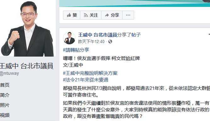 王威中7月4日在臉書(Facebook)粉絲頁分享文章稱,台北都市發展局已經表示,過去21年來從未依法認定涉事建築可當作寄宿住宅。