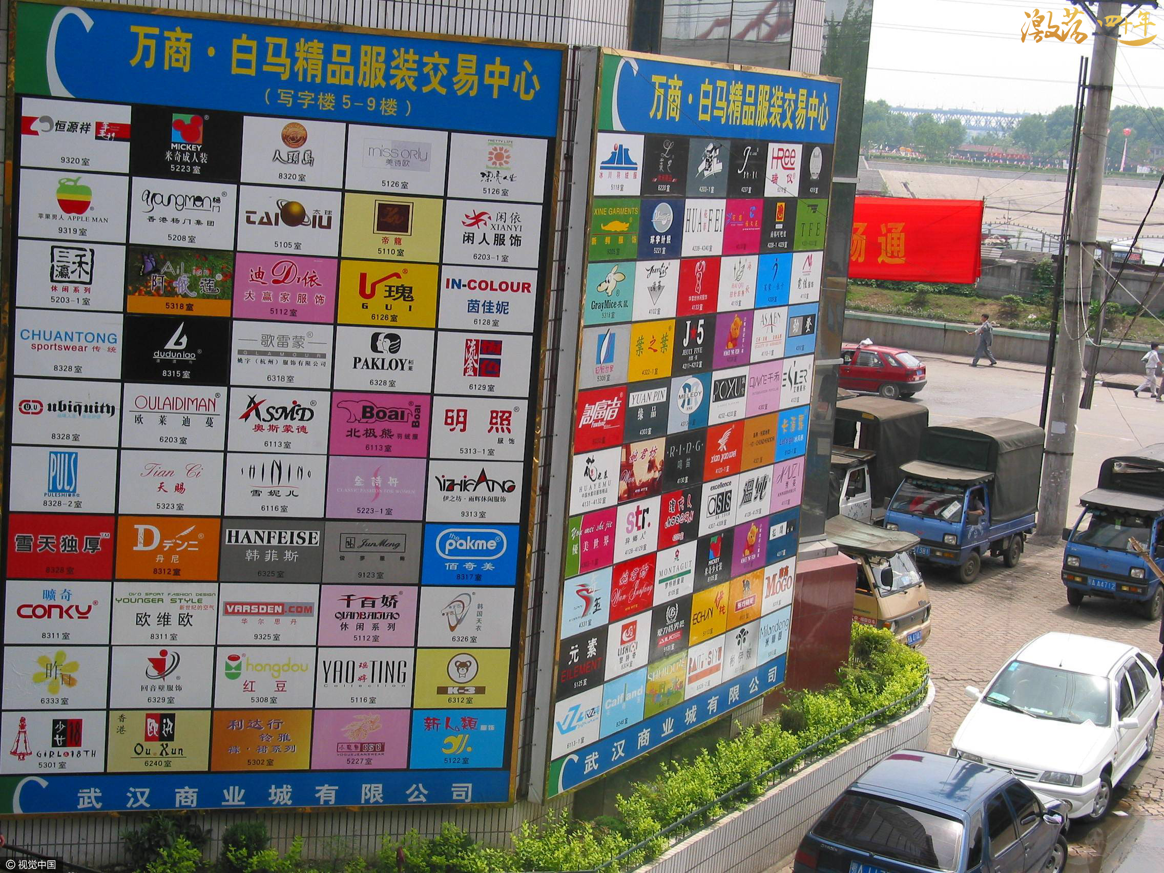 圖為2002年4月21日,在著名的武漢小商品市場漢正街一批發商城外,數百種品牌商標十分規範地掛滿了兩面牆,十分壯觀,一個生意人説,這既宣傳了產品又拉了生意(上面均註明了攤位號)。