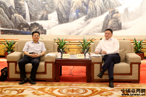 深圳市委書記王偉中(右)會見“海峽兩岸記者特區行”聯合採訪團一行,國務院台辦新聞局局長馬曉光(左)參與會見。(中國台灣網 尹賽楠 攝)
