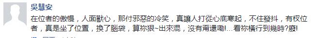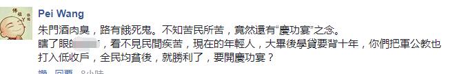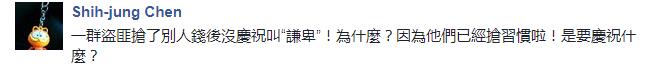 詩人渡也則發文稱,公敎人員大多是温良恭儉讓者,而蔡英文、賴神絕對不是!兩個違規搶人民財產者卻大言不慚地表示“我們沒慶祝,很客氣了,不然要怎樣”,難道他們兩位希望退休軍公敎人員向他們致謝道歉嗎?直言這是“得了便宜還賣乖!什麼叫欺人太甚?這就是了” 。