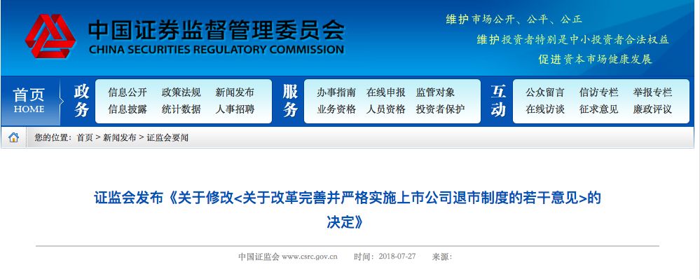 今年3月,證監會開始對上市公司退市制度的完善公開徵求意見,強化交易所一線監管職能。7月27日,正式稿出爐並要求“立刻施行”,可見統一意見已達成。
