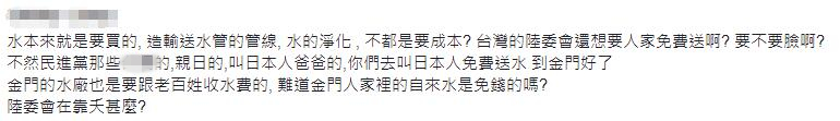 聽聞陸委會這番説辭,台灣網友都忍不了了:“這件事本身是極度缺水的金門大大受惠,大陸以每噸小於台灣島內自己供水的收費絕對是優惠價格,絕非盈利項目。以收費為由故意迴避優惠價格,陸委會操縱‘反中仇陸’民粹如潑婦罵街何時了?”“陸委會否認是‘惠台措施’,為什麼金門不從台灣引水?”