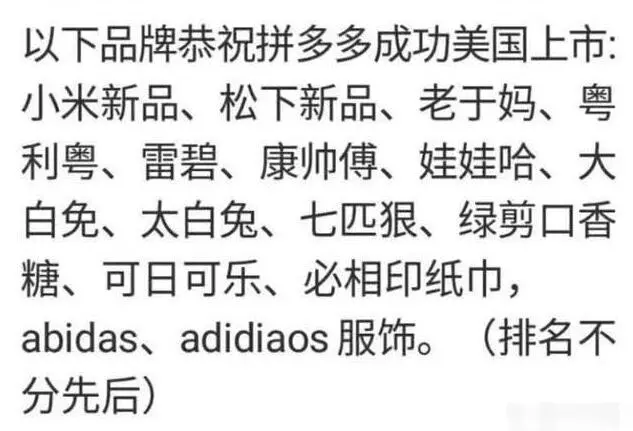 伴隨拼多多事件的不斷髮酵,知名商標與“山寨品牌”之爭也成為人們關注的話題。先是眾多山寨品牌“恭祝拼多多美國上市”的段子刷屏: