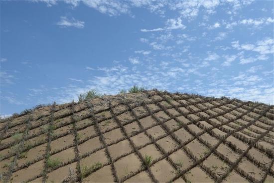 題圖 庫布其沙漠是中國第七大沙漠,位於內蒙古西南的鄂爾多斯市,是離北京最近的沙漠,總面積約1.39萬平方公里。經過30多年來幾代治沙人的努力,庫布其沙漠近三分之一面積得到治理,生態資源逐步恢復。圖為網格狀的沙柳在沙漠上,起到固沙的作用。視覺中國