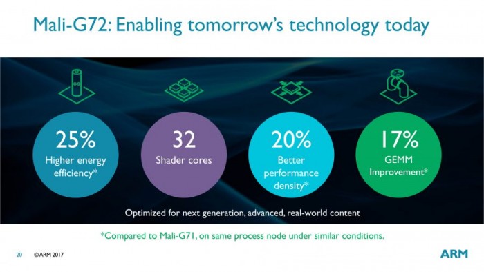 GPU一向來是Kirin系列處理器的短板,而Huawei這一次使用了這款ARM的Mali-G72 MP 24 GPU,相信可以更好地提升Kirin 980的圖像處理能力!根據ARM消息,Mali-G72在性能、機器學期和VR三方面都做了優化,其中性能是Mali-G71的1.4倍!功耗方面,G72降低25%,32個着色核心,單元性能提升20%,機器學習能力指標提升17%。
