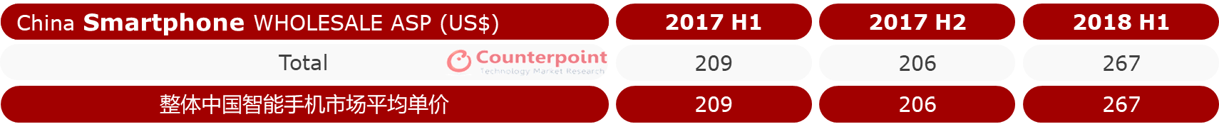 根據Counterpoint Market Pulse數據顯示:中國市場智能手機的平均單價(Average Sales Price, or “ASP” in short)從209美元增長到267美金,增長率超過20%(詳見圖表3)。ASP的增長是今年上半年市場的另一個主要特點。中國市場智能手機平均單價增長主要原因如下: