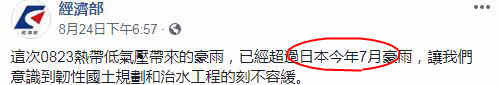 據台灣“中時電子報”8月26日報道,台當局“經濟部”24日在社交網站發文,卻説這次8·23熱帶低氣壓帶來的豪雨已經超過“日本平成30年”豪雨,還稱“讓我們意識到土地規劃和治水工程的刻不容緩。”