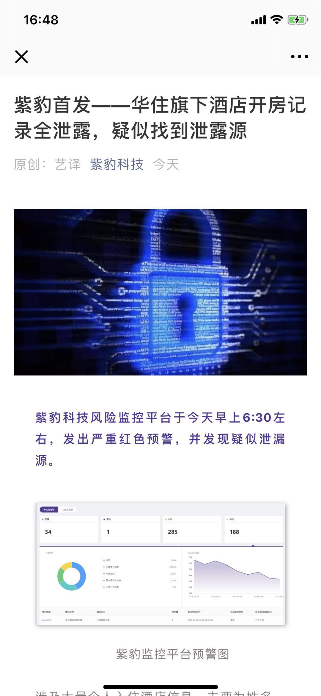 【環球網科技綜合報道】8月28日消息,根據紫豹科技微信公眾號消息披露,紫豹科技風險監控平台於今天早6:30左右監測到華住旗下酒店開房記錄泄露數據,內容涉及大量個人入住酒店信息,主要為姓名、身份證信息、手機號、卡號等,約5億條公民信息。