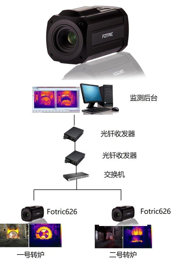 該方案實施過程並不複雜,2套Fotric 626,通過交換機彙總,再通過光釺傳輸到控制室。控制室內的後台專業監測軟件TrendIR ,來實現熱像畫面的即時展現,數據的分析、存儲等。