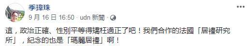 台灣大學公共衞生系教授季瑋珠就在社交網站發文質疑,“這是政治正確、性別平等得矯枉過正了吧!”