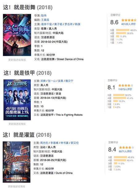 以聚焦青年圈層文化作為策劃的出發點,優酷的“這就是”系列先後涉足街舞、機器人格鬥、街頭籃球等多個潮流文化領域,《這就是街舞》《這就是鐵甲》《這就是灌籃》三檔原創節目在豆瓣的評分均超過8.0,“這就是”系列成為2018年品質網綜的代名詞,同時也成為行業內首個獲得市場認可的綜藝廠牌。