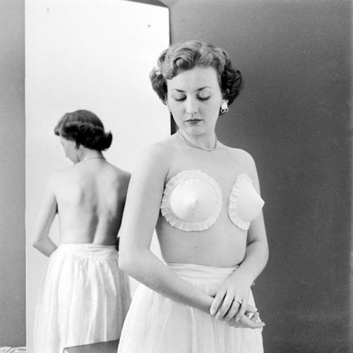 1949年5月,在二戰結束後沒幾年,一項大膽的海濱服裝創新在美國紐約瓊斯海灘首次亮相。粘合胸罩是工業家查爾斯-L-朗斯的點子,它是一種無肩帶、無揹帶、無繩、無支撐、圓錐狀胸罩,用特製的粘合劑粘好背部,目的是保持在劇烈運動情況下不脱落下來,但同時又得容易且無痛脱掉。朗斯稱這種胸罩是完美胸罩,從當時拍攝的一組照片來看,它可以搭配沙灘短褲,甚至可以作為內衣搭配晚禮服,無線、無吊帶和無揹帶,它們有各種各樣的顏色和圖案,用朗斯的話來説,完美胸罩是革命性的。
