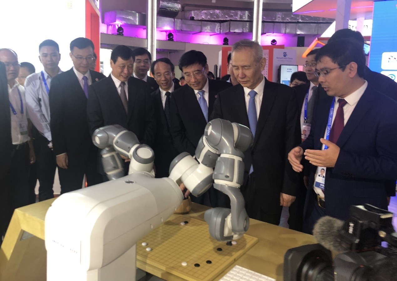 劉鶴副總理與星陣圍棋對弈(前排右2國務院副總理劉鶴;前排右3工信部部長苗圩;前排右4上海市市長應勇;前排右1星陣圍棋CEO金涬)