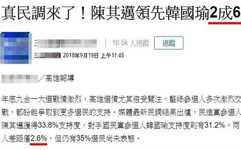 不過有一家媒體引述此民調時,內文雖正確寫為“兩人差距僅2.6%”,但標題卻下成“真民調來了 陳其邁領先韓國瑜2成6”,亦即,標題把“2.6%”誤會成“2成6”!