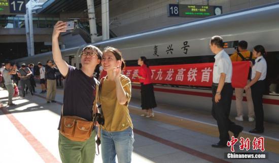9月23日,北京西開往香港西九龍的G79次“復興號”高鐵列車在北京西站首發。圖為旅客在首發列車前拍照。中新社記者 賈天勇 攝