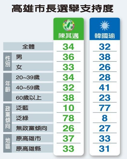 《聯合報》的最新調查發現,高雄市選情五五波,民進黨參選人陳其邁獲得34%選民支持,32%選民則力挺國民黨參選人韓國瑜,選戰陷入膠着,進入到所謂的黃金交叉範圍內,韓國瑜未來的漲勢可能比陳其邁更強勁。