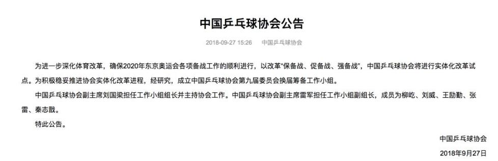 今天下午,中國乒乓球協會發布公告稱,將進行實體化改革試點。