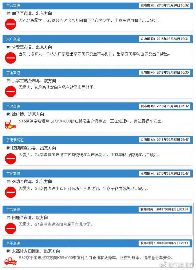 接首發集團信息,因霧大,G1京哈高速雙向白鹿至市界封閉;G4京港澳高速出京方向琉璃河至市界封閉,出京方向車輛由琉璃河出口駛出;G5京昆高速出京方向張坊至市界封閉,出京方向車輛由張坊出口駛出;G3京台高速出京方向佃子至市界封閉,出京車輛由佃子出口駛出;G45大廣高速出京方向求賢至市界封閉,出京車輛由求賢出口駛出;S11京承高速雙向京承主站至酸棗嶺封閉;G45大廣高速雙向穆家峪至市界封閉,請您提前選擇好繞行路線。