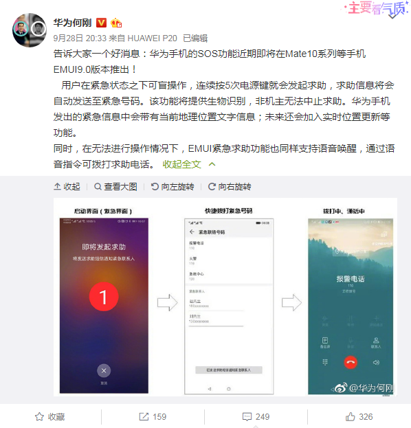 【環球網科技綜合報道】日前華為終端手機產品線總裁何剛在微博發消息稱,華為手機的SOS功能近期即將在Mate10系列等手機EMUI9.0版本推出。此前用户在網絡上對EMUI加入SOS功能的呼聲得到回應,引發了不少網友點贊。