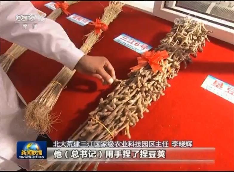 *北大荒建三江國家級農業科技園區主任 李曉輝:*他(總書記)用手捏了捏豆莢,看一下飽滿程度,説結莢還是比較多的嘛。同時他拿起植株,問了下植株的情況,我們跟總書記回答,結莢層數14層,蛋白質含量達到44%。總書記聽完之後很欣慰地點了點頭。