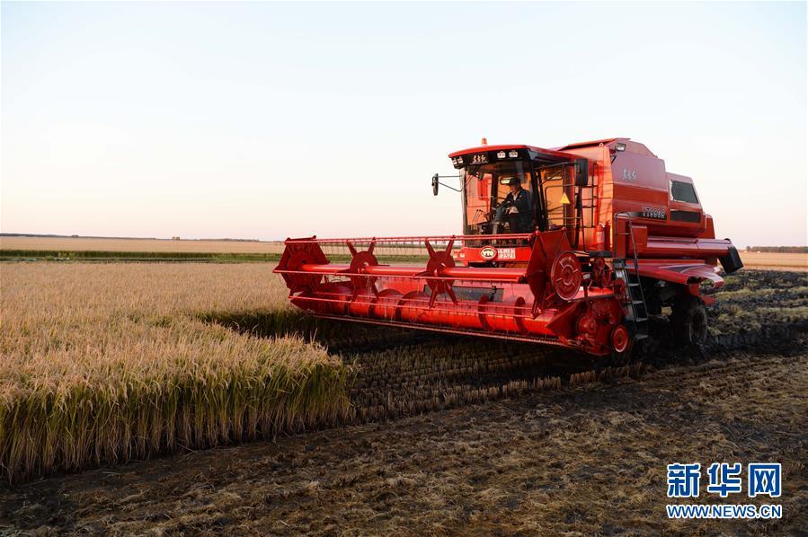 9月26日,黑龍江農墾建三江管理局七星農場職工秦泗利駕駛收割機進行水稻收割作業。 新華社記者王凱攝