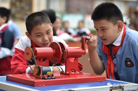 2018年9月18日,石家莊市草場街小學的同學們在體驗“磁力發電”小實驗,探索科學的奧秘。新華社發(章朔 攝)