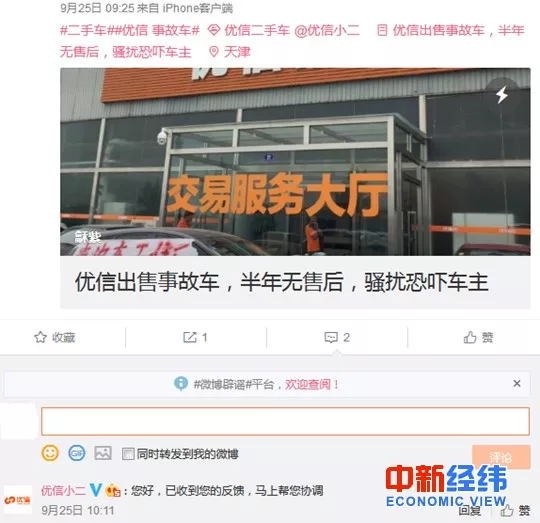 9月25日,唐女士通過微博將事件整理發佈並@優信小二。優信小二回複稱,已收到反饋,馬上協調。不過,唐女士表示,截至目前還是沒有人與她聯繫。