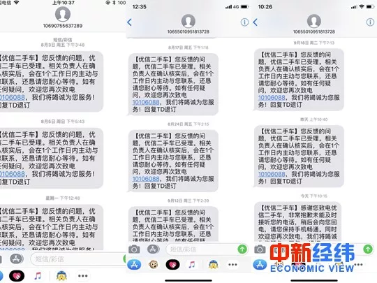 “您反饋的問題,優信二手車已受理。在確認核實後,會在1個工作日內主動與您聯繫。”唐女士無奈地向中新經緯表示,類似的短信她已經收到上百條了,但優信方面並沒有工作人員出面解決問題。與此同時,因唐女士表示要拒絕再為這輛車還貸款,唐女士家人接到的催債騷擾電話也越來越多了。