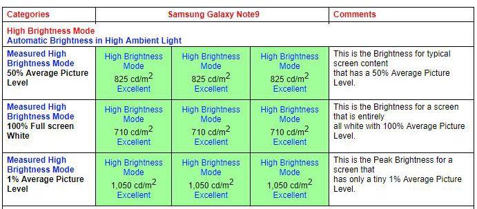 而 Galaxy Note 9,在關閉自動亮度且亮度滑塊手動設置為最大的情況下,全白 100% APL 全屏亮範圍為 376 cd/m⊃2;- 410 cd/m⊃2;(尼特),在非全白僅 1% APL 圖像下,峯值亮度為 370 cd/m⊃2;- 532 cd/m⊃2;(尼特)。