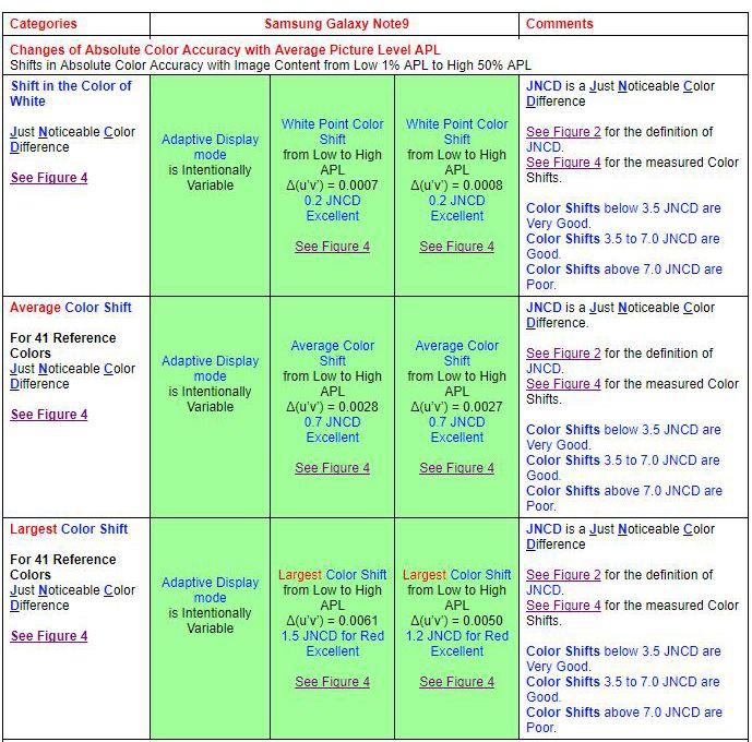 可能很多人會説,三星 Galaxy Note 9 也有個自適應顯示模式,但 DisplayMate 表示,在此模式下,屏幕主要是動態調整圖像和視頻顯示效果的功能,根據內容和周圍環境光照明情況提供最適用於某些應用的顏色。其中。D65 帶白點、色域、顏色飽和度與環境光傳感器在其中均會動態調整。DisplayMate 還提到,自適應顯示模式提供了更高色彩飽和度,色域比常規 sRGB / Rec.709 大 142%,比 DCI-P3 大 113%,所以並不適合精確顯示內容。