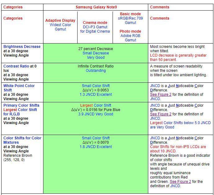 Galaxy Note 9 四個用户可選的屏幕模式:自適應顯示模式、AMOLED 電影模式、AMOLED 照片和基本屏幕模式。有 3 個色域標準,包括 DCI-P3、 Adobe RGB 和 sRGB / Rec.709,並且有多個屏幕模式。其中,影院屏幕模式匹配 DCI-P3 標準色域,基本屏幕模式匹配 sRGB / Rec.709 標準色域,照片屏幕模式匹配 Adobe RGB 的色域,自適應顯示屏幕模式具有最寬的色域。