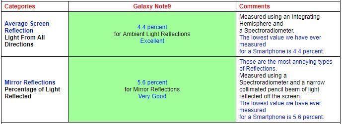 從 DisplayMate 報告瞭解,這兩者屏幕反射率都是測試過的智能手機中超低水平了。在相對明亮的照明環境下,移動設備的顯示屏顯示的圖像很容易受到反射光線的影響,包括日光燈,吊燈,從窗口進來的光線,直接或簡潔的室內外日光等等,圖像質量會出現明顯降低,使之難以閲讀屏幕內容,而如此接近的屏幕反射率,其體現出的屏幕顯示效果幾乎相同。