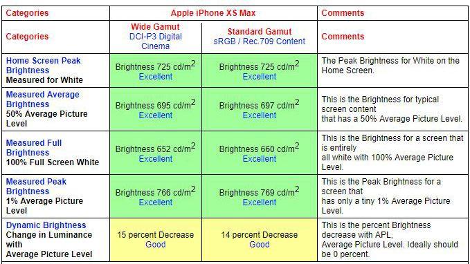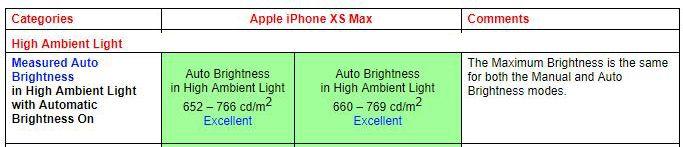 經過測量結果顯示,在關閉自動亮度且亮度滑塊手動設置為最大的情況下,蘋果 iPhone XS Max 全白 100% APL 全屏亮度破了記錄,達到 660 cd/m⊃2;(尼特),在非全白僅 1% APL 圖像下,峯值亮度為 769 cd/m⊃2; (尼特)。