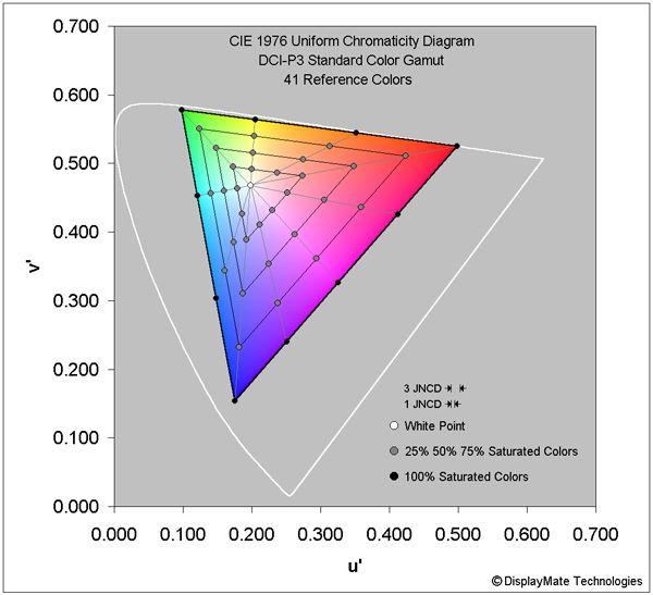 DisplayMate 通常使用專業先進的光譜儀器測量手機屏幕的色彩精確度,針對每個色域進行了 41 個基準顏色點(三角形內的分層顯示了 25%、50%、75% 和 100% 的飽和度的顏色)的精確測試,並用自家的 JNCD(Just Noticeable Color Difference,用來反映色彩偏移程度)單位作為評級,評級數字越小代表着色彩偏差非常小,一般小於 3 就表明幾乎無法直觀察覺偏差,眼睛對色彩看起來是完全準確的。