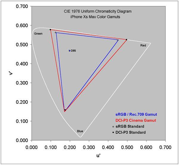對比 DisplayMate 的兩款機子的測試報告,iPhone XS Max 的 sRGB/Rec.709 色域覆蓋 102%,該色域下屏幕色彩精確度評級為 0.8 JNCD;DCI-P3 色域覆蓋 103%,該色域下色彩精確度評級也是 0.8 JNCD。