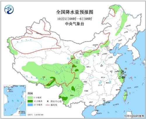10月5日08時至6日08時,黑龍江西部、吉林西部、河北北部、江南東部、西南地區大部、新疆西部、西北地區東南部、西藏和台灣島等地部分地區有小到中雨,其中,江蘇東南部、浙江北部等地局地大雨(25~40毫米)。內蒙古東部、東北地區南部等地的部分地區有4~6級風(見圖3)。