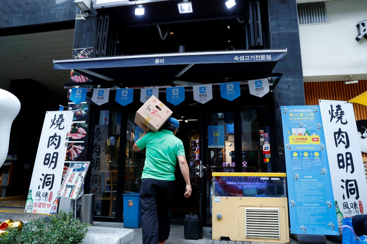 韓國明洞一家烤肉店的老闆樸女士表示,中國國慶假期期間,自己的生意比平時好了六七倍。“自從接入了支付寶以後,來我這裏的中國遊客幾乎全都用手機付款。假期結伴旅行的朋友很多,人均消費也比平日裏高不少。”