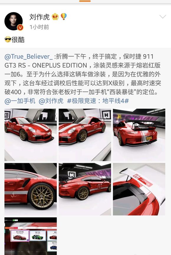 日前,劉作虎轉發了一條內容是關於保時捷911 GT3 RS - ONEPLUS EDITION車型的微博,稱這輛車的塗裝靈感來自於熔岩紅版一加6,微博上還附了一組保時捷911 GT3 RS - ONEPLUS EDITION車型的實拍照片。劉作虎轉發稱“很酷”。