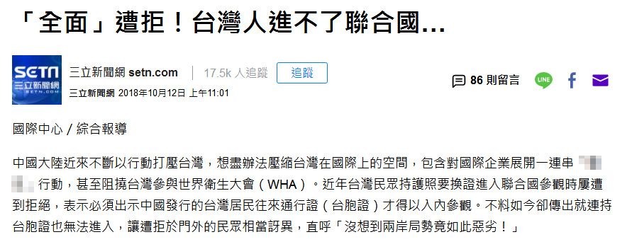 12日,綠媒也開始關注台灣記者的閉門羹待遇。三立電視台就引述了聯合新聞網的報道,並在標題上表達了驚訝:《全面遭拒!台灣人進不了聯合國》。