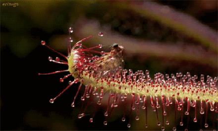 ↑這是對一株好望角毛氈苔(南非茅膏菜,Drosera capensis)的延時攝影。它的葉片上伸出很多色彩鮮豔的“觸手”,會分泌粘液捕捉昆蟲。當昆蟲落網時,葉片會逐漸捲起幫助消化。需要注意的是,實際葉片捲起的速度要慢得多,全過程需要數小時時間。(錄製者:David Rogers)