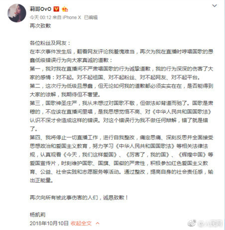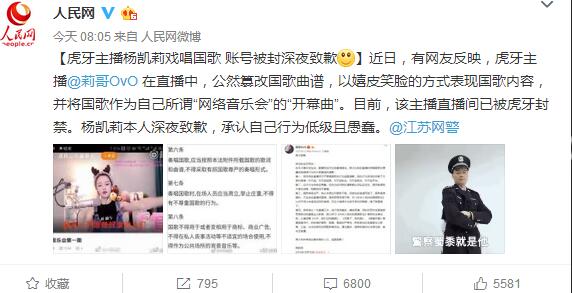另據人民網微博消息,【虎牙主播楊凱莉戲唱國歌 賬號被封深夜致歉】近日,有網友反映,虎牙主播@莉哥OvO 在直播中,公然篡改國歌曲譜,以嬉皮笑臉的方式表現國歌內容,並將國歌作為自己所謂“網絡音樂會”的“開幕曲”。目前,該主播直播間已被虎牙封禁。楊凱莉本人深夜致歉,承認自己行為低級且愚蠢。