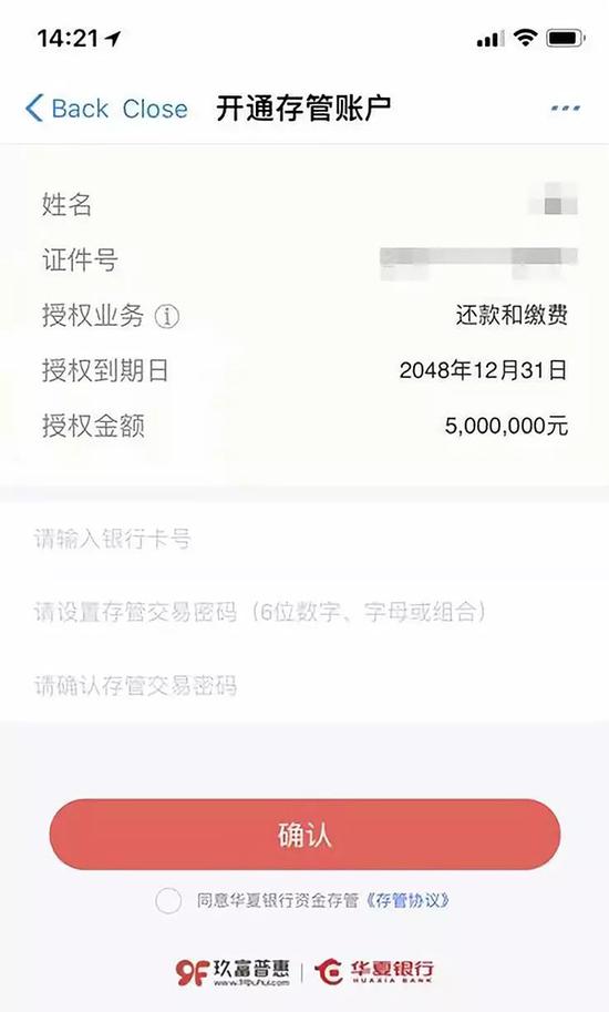 打開李紅支付寶APP,搜索相寓,進入“信用租房-我的賬單”,“開通存管賬户”頁面赫然寫着授權500萬元資金託管,輸入李紅的銀行卡號、設置存管交易密碼等信息後,才能進行下一步操作。而我愛我家對此解釋為“國家統一規定”,但李紅多次詢問這是哪條規定,未果。