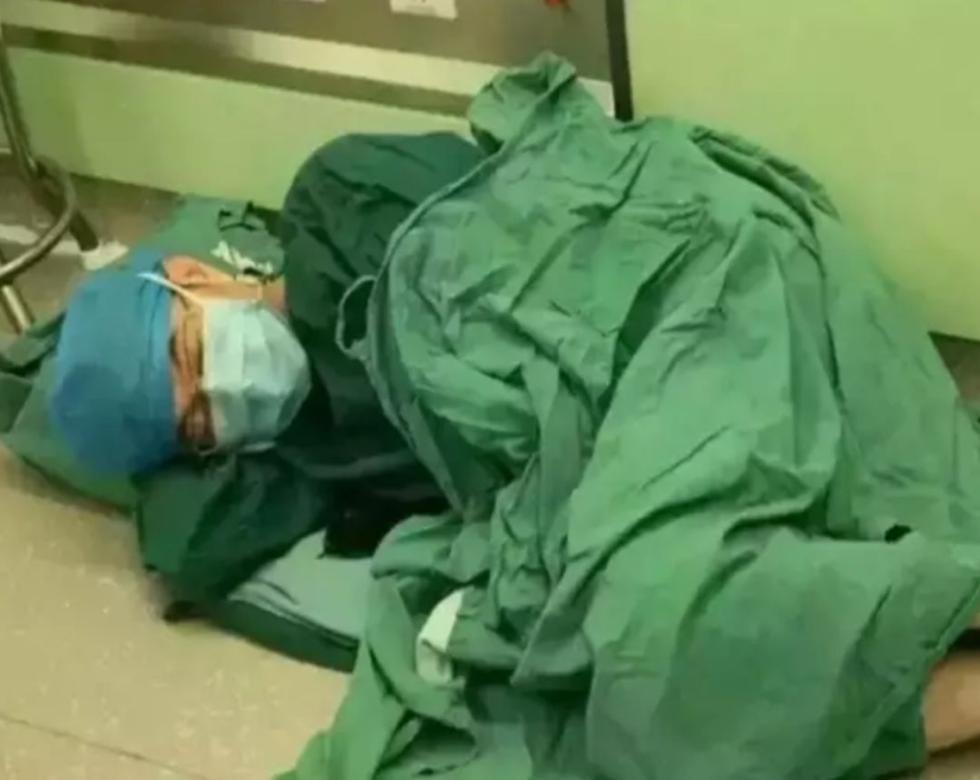 一天完成了18台手術的他,太累了,直接在地上睡着了。他曾經被查出胃癌,手術後化療一結束,在化療反應還沒完全消失的情況下,他又重新站在了手術台上。