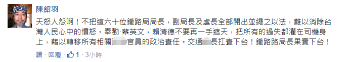 針對此次事故的調查結論,有島內網友表示,“這些所謂的高管為了脱身,不惜將所有的責任都推給一個司機,難道晚上能睡的安穩嗎?”;還有人指出,“如不將這些高管繩之於法,恐怕難以平息民眾的怒火。”