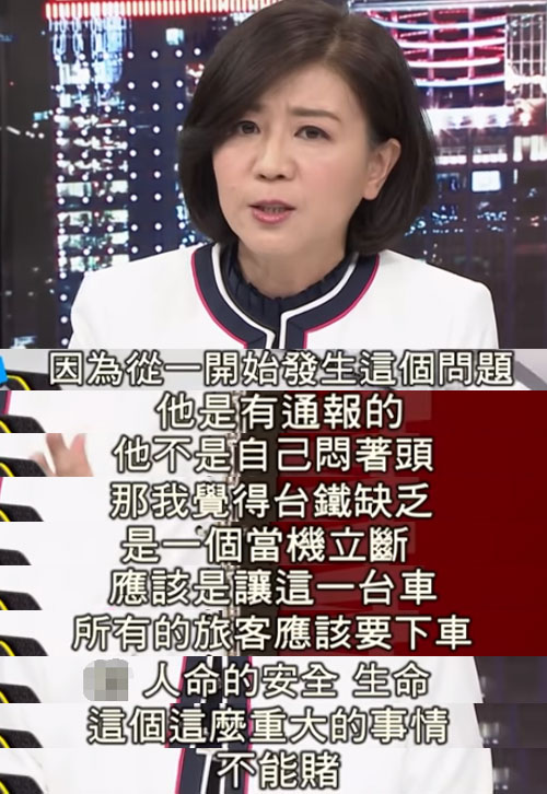 對此,國民黨“立委”王育敏怒批,“台鐵高管們明知道列車出現了問題,還要堅持完成既定行程,這是在拿民眾的生命做賭注。”