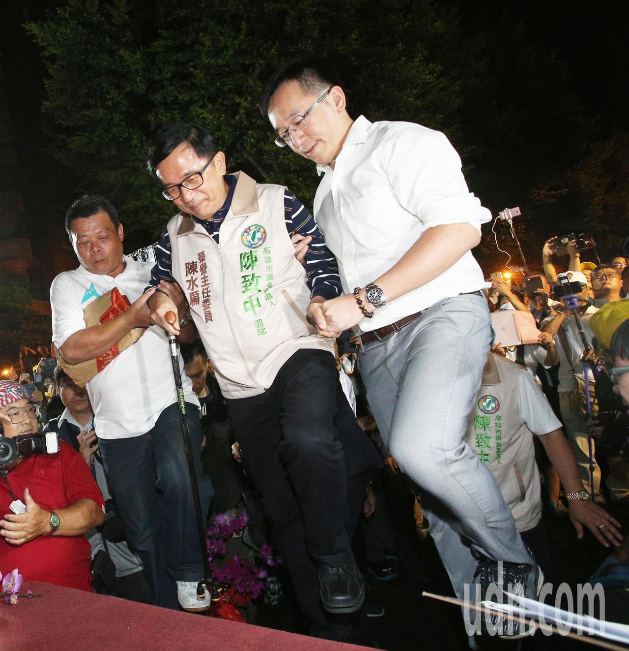 據台灣《聯合報》10月29日報道,民進黨高雄市長候選人陳其邁、民進黨高雄市議員候選人陳致中的聯合競選總部當晚成立。針對目前保外就醫的陳水扁,台中監獄方面同意他參加此次晚會,要求他“不上台、不演講、不談及政治、不接受媒體採訪”。