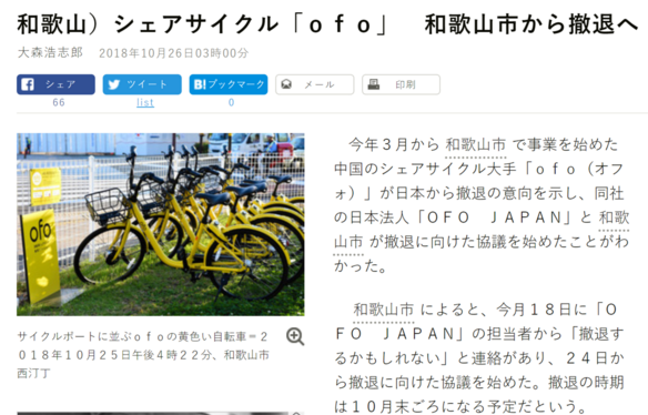 據報道,由於中國市場競爭激化和亂停亂放問題的應對成本,ofo經營能力的下降。10月中旬開始,日本滋賀縣大津市、和歌山縣和歌山市和福岡縣北九州市陸續接到ofo方面的電話,被告知打算退出日本市場。